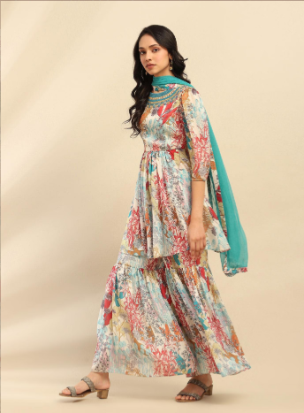 Material : Kurta- Recycled Polyester Chinnon ( 100% Polyester ), Sharara- Rec Poly Chinnon ( 100% Cotton ), Dupatta- Rec Poly Chiffon ( 100% Polyester )